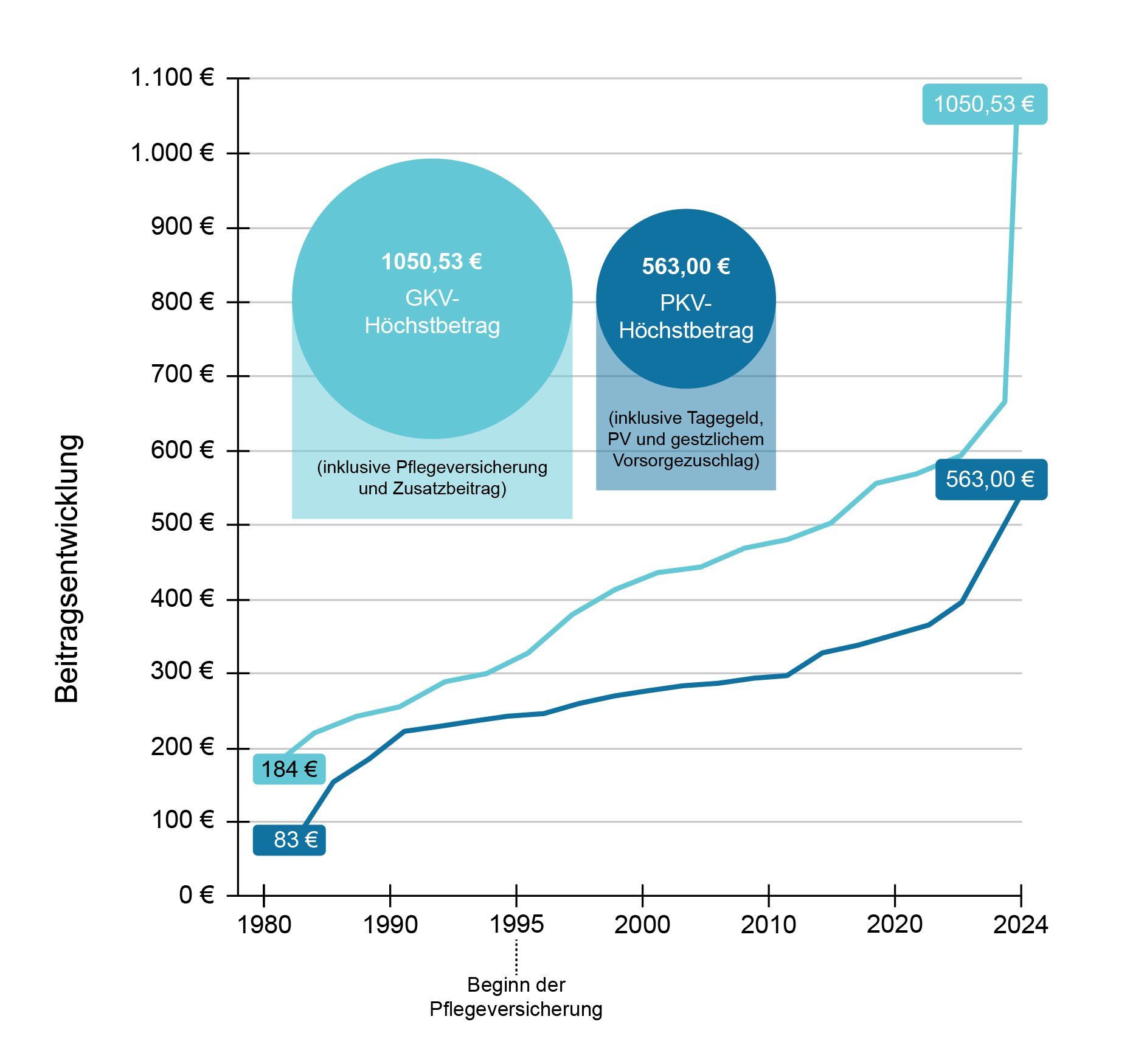 Vergleich der monatlichen Höchstbeiträge zur Kranken- und Pflegepflichtversicherung für 2024